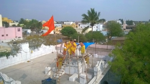 Devotees climbing the temple roof for Kumbha Abhishekam